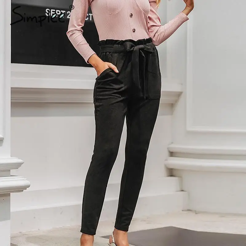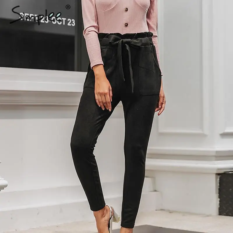 Product Name: Simplee Suede wysokiej talii ołówkowe spodnie capris kobiety dół sash streetwear casual spodnie 2018 jesień elegancki czarny zimowe spodnie