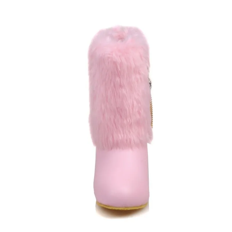 Special Offer Buty damskie jesień zima ciepłe futro 2018 nowa seksowna moda Pu połowy łydki buty motocyklowe śnieg czarne różowe białe buty na wysokim obcasie Discount 47% Today!