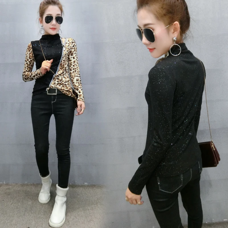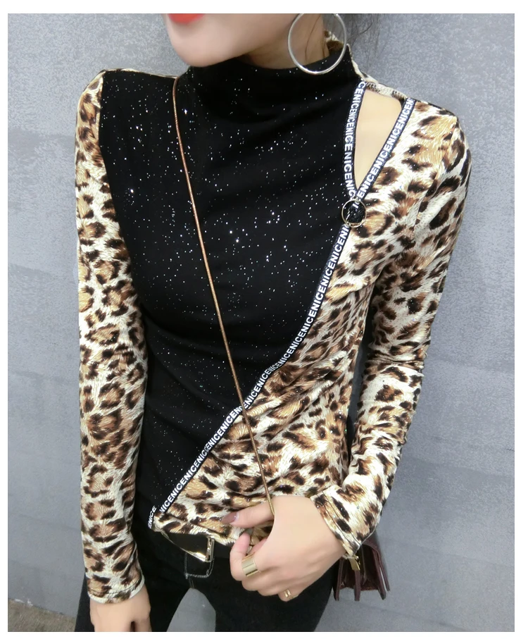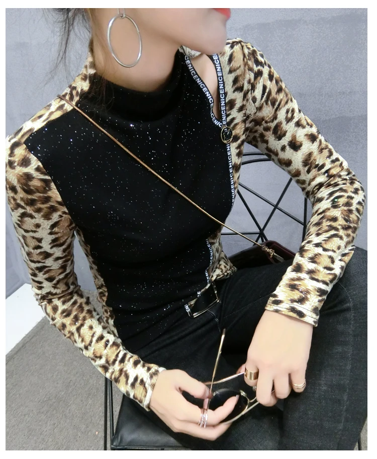 Special Offer Patchwork Leopard sweter Tshirt 2019 nowa wiosna jesień kobiety cekinami długa koszula z golfem T shirty ubrania T91801 Discount 30% Today!